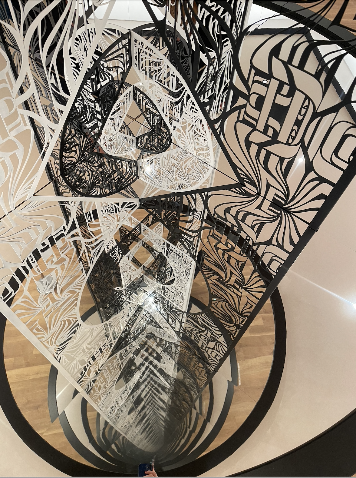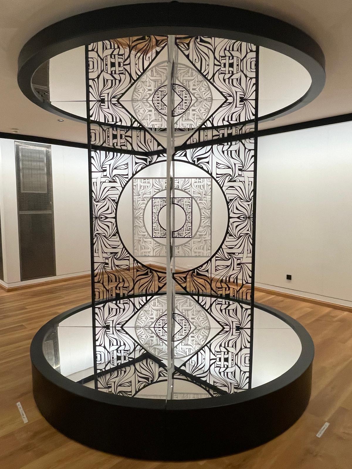 Hommage à la verticalité et à la clarté de l’immeuble Lumière, cette sculpture fusionne géométrie et illusion d’optique. Astro utilise la finesse d’une dentelle de calligraphies pour créer une profondeur saisissante. La colonne devient puits, et la matière se fait lumière.
