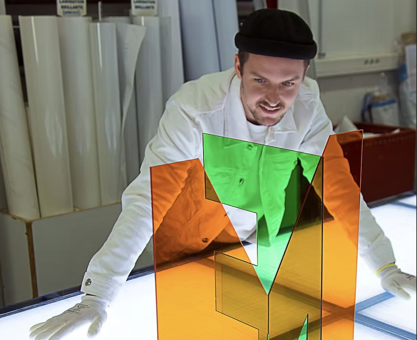 Pierre Brault a souhaité mettre en avant le côté futuriste et minimaliste de l’immeuble UX. Par la superposition de plexiglas, l’oeuvre créée une onde colorée. Les couleurs se croisent et se superposent pour créer une multitude de teintes différentes.